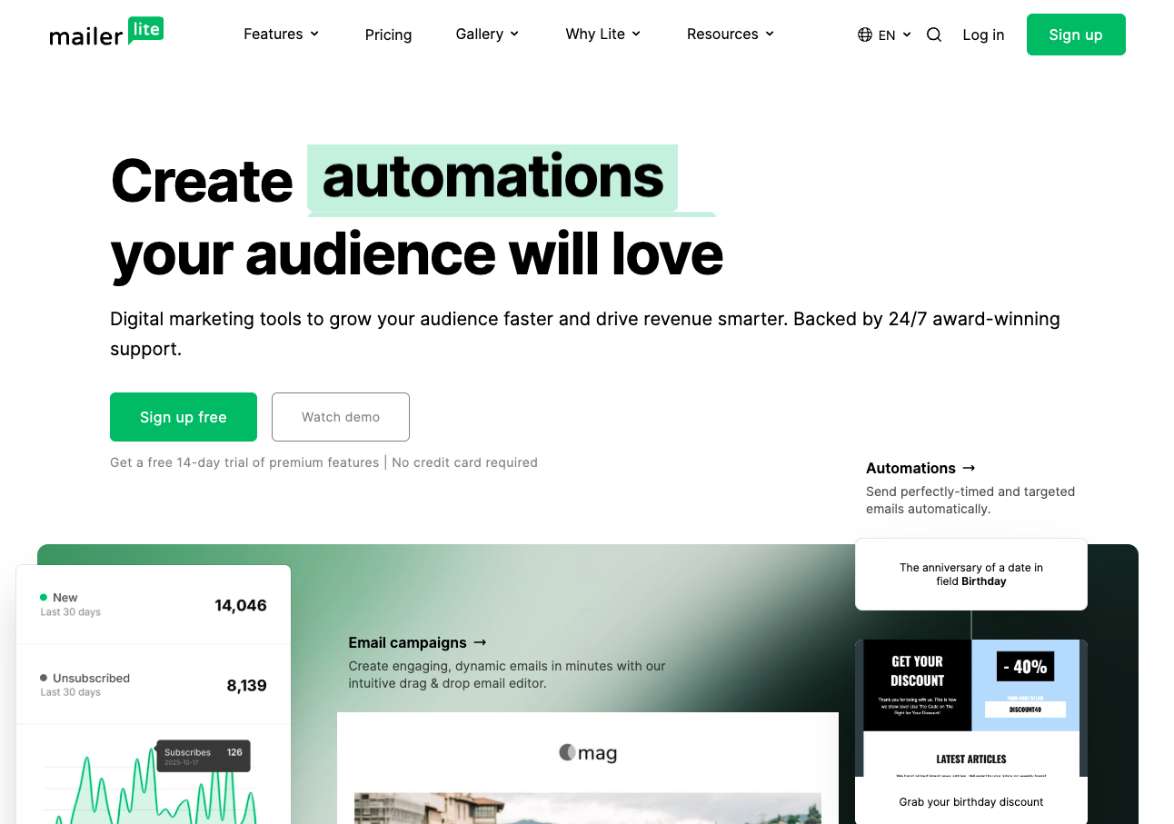 MailerLite is an email marketing platform built for simplicity and affordability. It offers everything you need to create newsletters, build landing pages, set up automations, and even create websites — all from one platform. With a generous free plan covering up to 1,000 subscribers, it’s a popular choice for small businesses, creators, and startups.